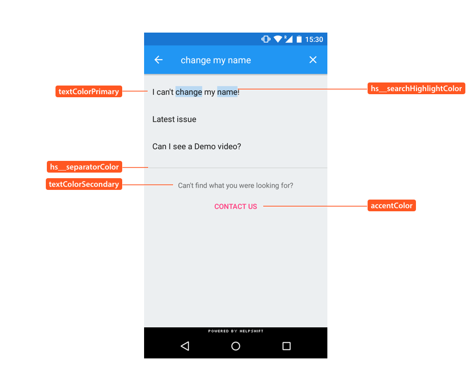 The following illustrates use of these styleable attributes over Helpshift SDK's UI: